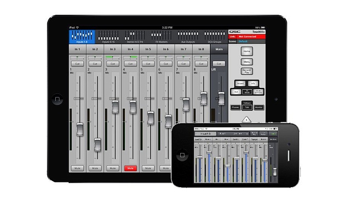 Полный комплект функций доступен для пользователей планшетных устройств на обеих платформах - на Android смартфонах или Apple IPhone и IPod Touch устройствах. До 12 внешних устройств, содержащих любую комбинацию из Android или Apple, IOS смартфонов или планшетов могут быть одновременно подключены к микшеру TouchMix. При эксплуатации нескольких беспроводных устройств, оператор может разрешить или запретить доступ к функциям любого устройства непосредственно с микшера.