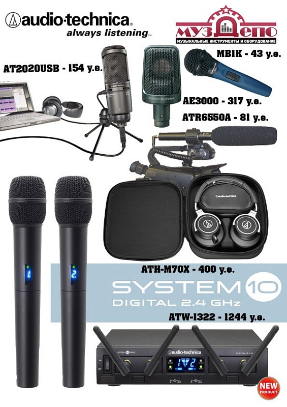 Одновременно могут работать пять систем с двумя приемниками – итого 10 каналов. Еще одна новинка – мониторные наушники ATH-M70X. Имея рабочий диапазон частот 5 – 20000 Гц, наушники пригодны для самого широкого круга задач – мониторинга, микширования, мастеринга, диджеев, FOH, пост – продакшна и просто прослушивания музыки. Из популярных моделей поступили микрофоны АТ2020, АТ2020USB, АТ2010, накамерный ATR6550, АЕ3000, бюджетные наушники АТН-М20Х, АТН-М50Х, АТН-Т200, ATH-TAD300, бюджетные микрофоны МВ1К, МВ3К. Микрофоны АЕ6100, PRO45, стерео AT8022XY и многое другое. Звоните!