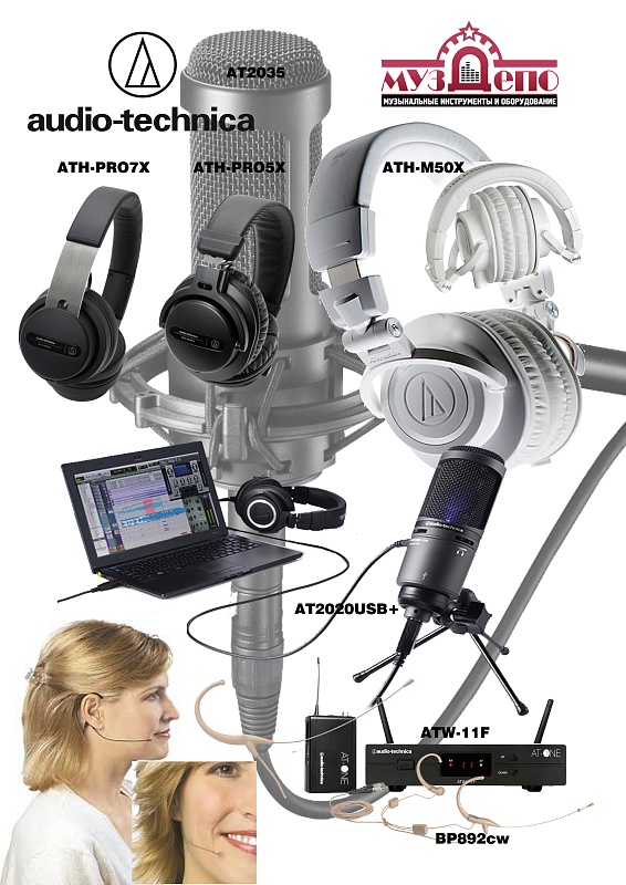 AT2020, AT2020USB+, AT2020USBi, AT2035, для мониторинга – наушники: ATH-M50XWH (белого цвета), ATH-R70X, для диджеев: ATH-PRO5XBK, ATH-PRO7X, UHF радиосистема ATW-11F (без микрофона) и в дополнение к ним – микроминиатюрные головные микрофоны BP-892cw (телесного цвета), вокального качества, абсолютно незаметные, идеально подходящие для сцены.