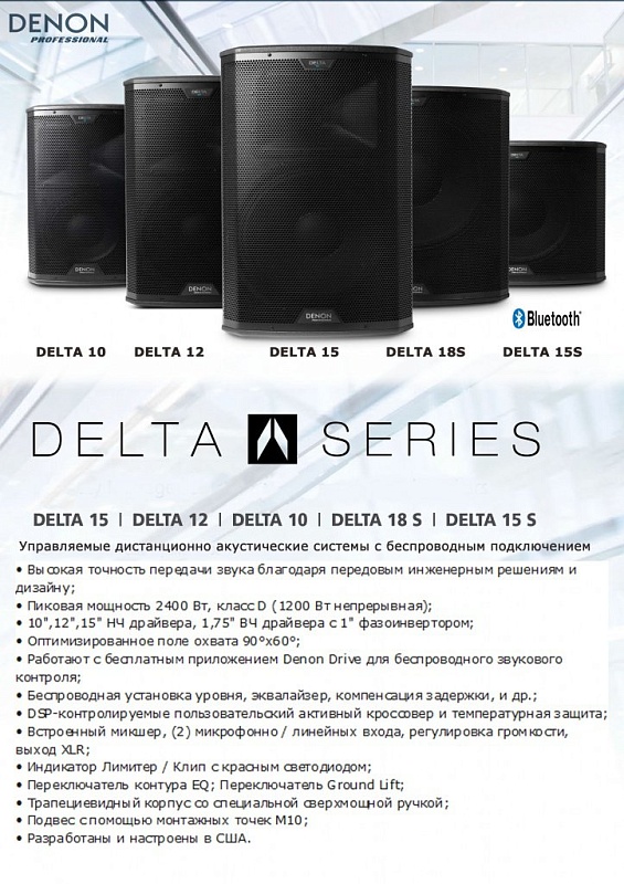В ряду новинок компании DENON 2015 года заявлена серия акустических систем DELTA с беспроводным управлением с iPad или iPhone, коммутируемая по Bluetooth, со встроенными DSP, обработкой. Серия состоит из 3-х сателлитов 10", 12" и 15" плюс 2 сабвуфера 15" и 18".