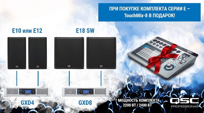 Новая специальная акция! При покупке комплекта акустических систем QSC Серии Е с цифровыми усилителями – вы получите микшерный пульт в подарок!